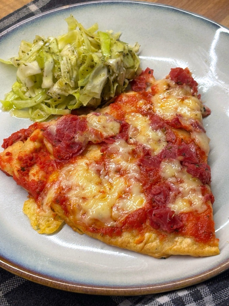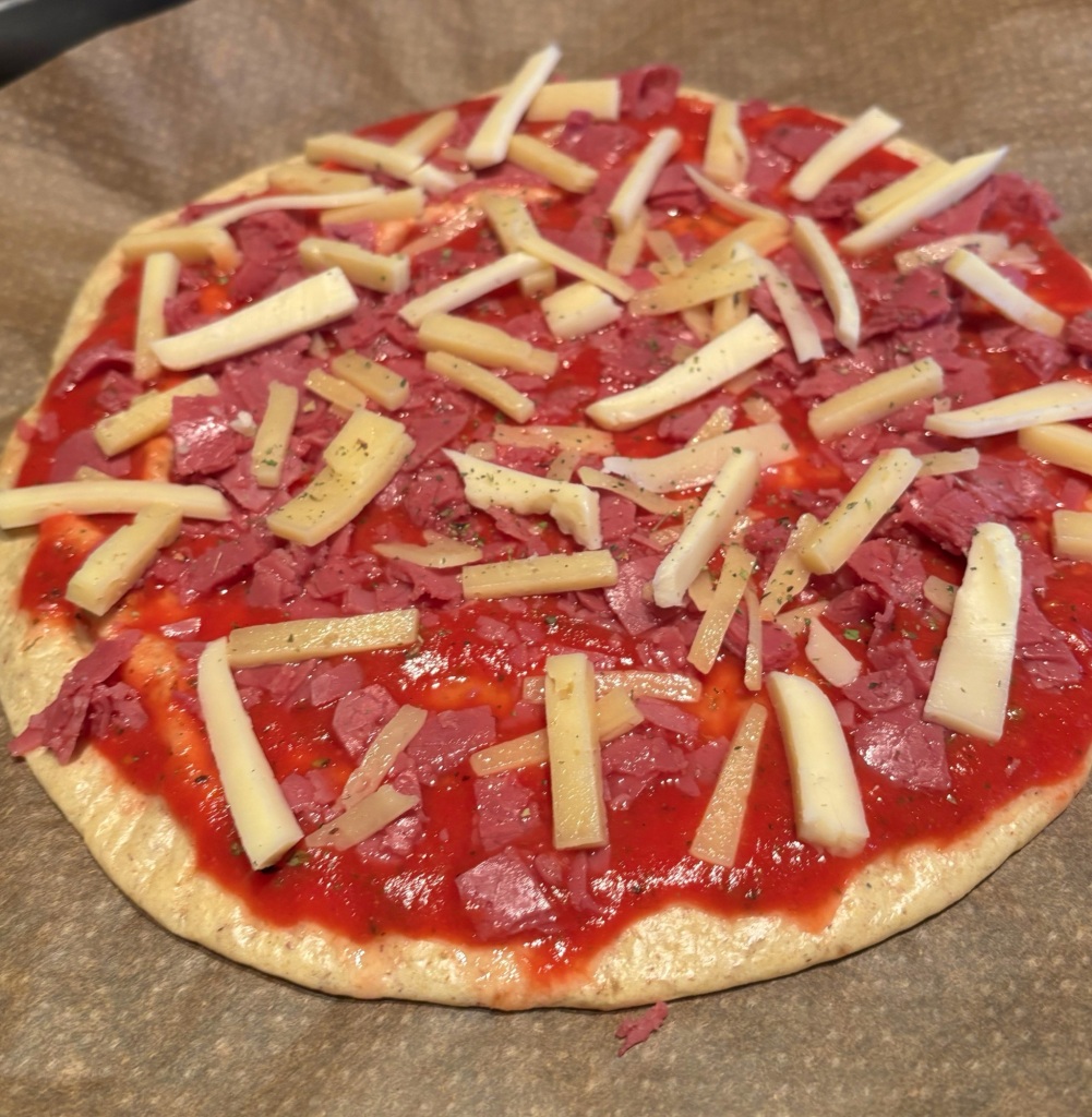 Självklart kan man unna sig pizza mitt i veckan. Den här fusk-varianten är både nyttig, mättande och god och innehåller 350 kalorier och inte mindre än 54 gram protein. Perfekt om man tränar. Jag har valt saltrulle av nötkött som fyllning och riven mager ost som är extra proteinberikad.